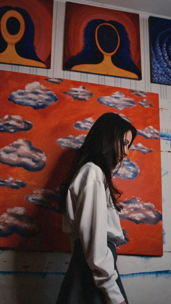 The red sky on the canvas serves as a symbol of a dangerous external world, while the clouds simultaneously embody an anxious internal state.