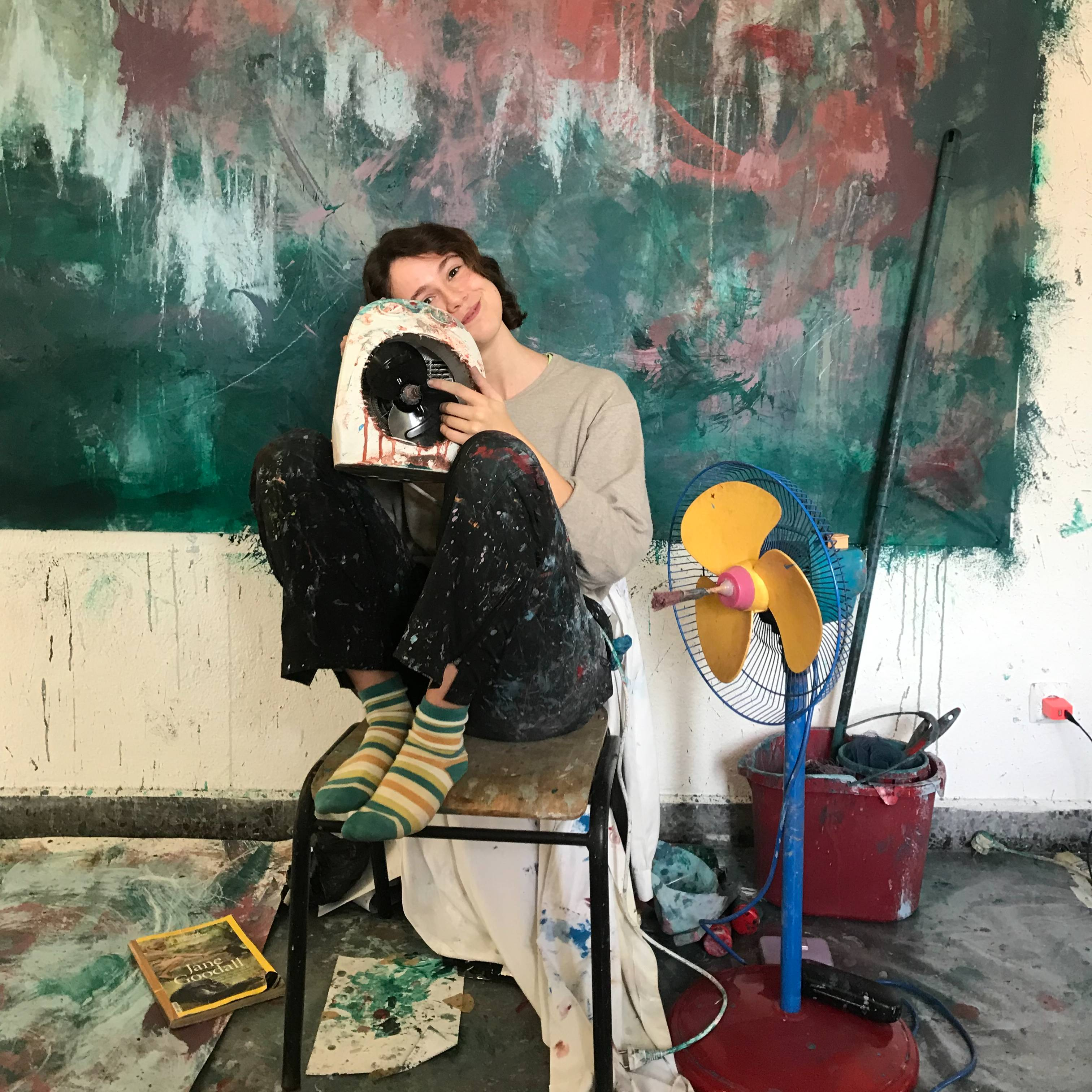 Capi [Maria Inês Alves (2003)] is currently in her final year of a degree in Painting at the Faculty of Fine Arts of the University of Lisbon. In her work, she explores the absurdity and irony of the nature of materials through assemblage, by changing the functionality of the everyday objects she finds. She is drawn to a spectrum of media such as painting, sculpture, drawing and installation, exploring the potential of each object, transcending its function into something chaotic and ridiculous, thus transforming them into new instruments for painting and Painting itself. In this relationship between making and realising, she dedicates herself to the limits of what a work of art is.