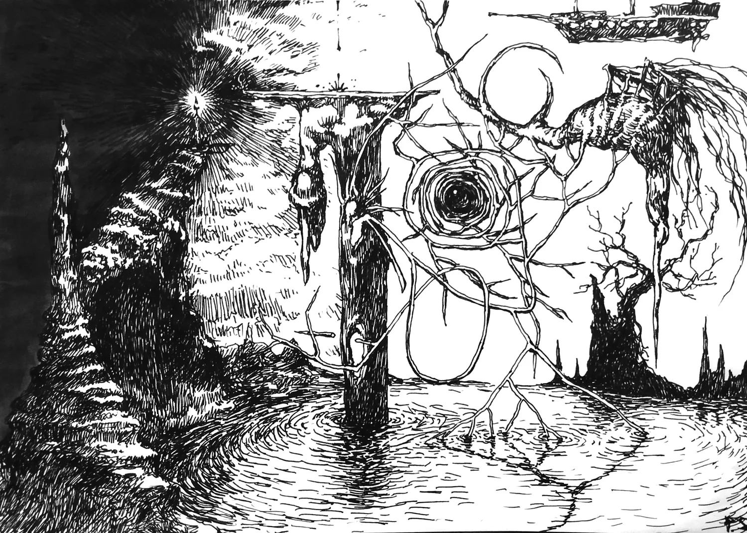 Watercolour & gouache washes: translucent mood pooling around crisp contour lines.