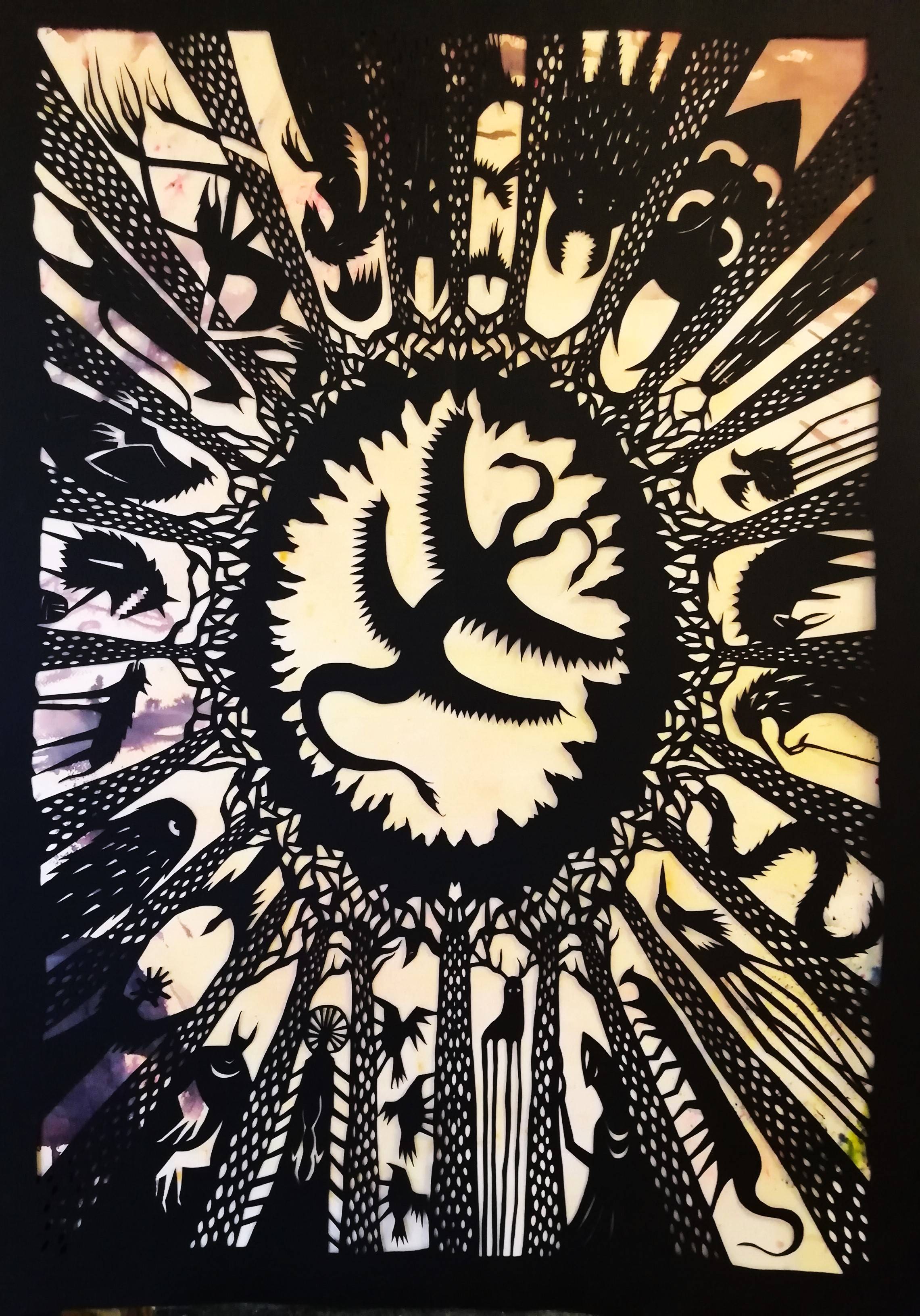 Anything strictly visual that fuses more than one technique: stitched fabric over watercolor washes, newspaper clippings sealed beneath resin, driftwood painted neon and bolted onto steel. Add sound or video and you’ve wandered into multimedia; keep it retinal, and you’re in mixed-media territory.